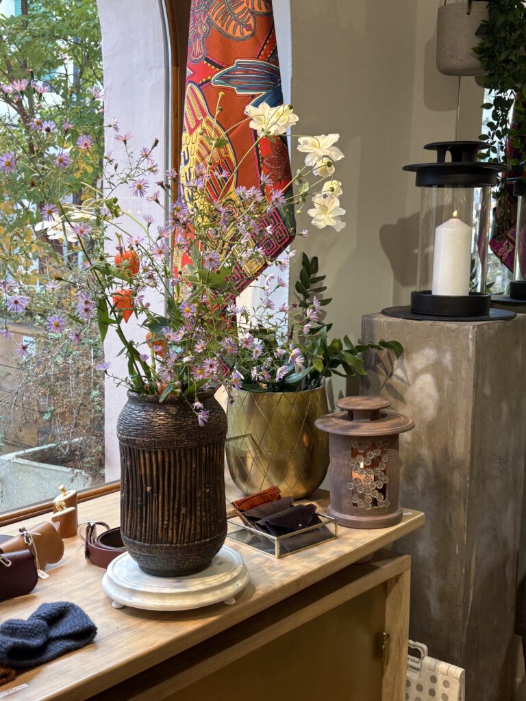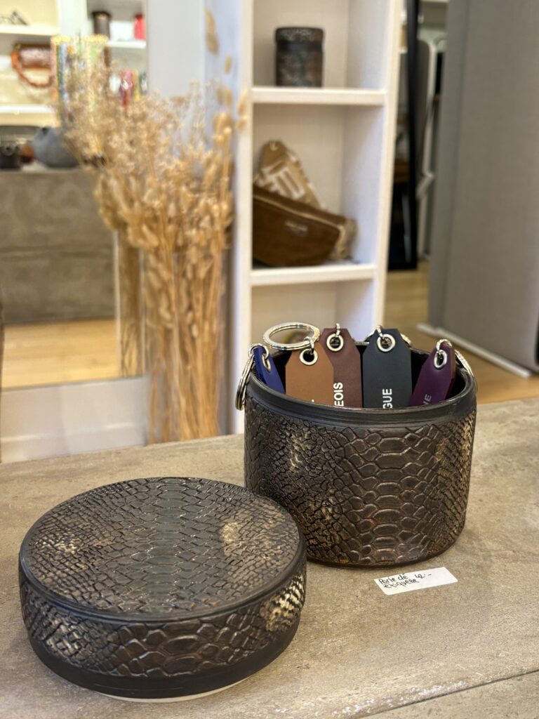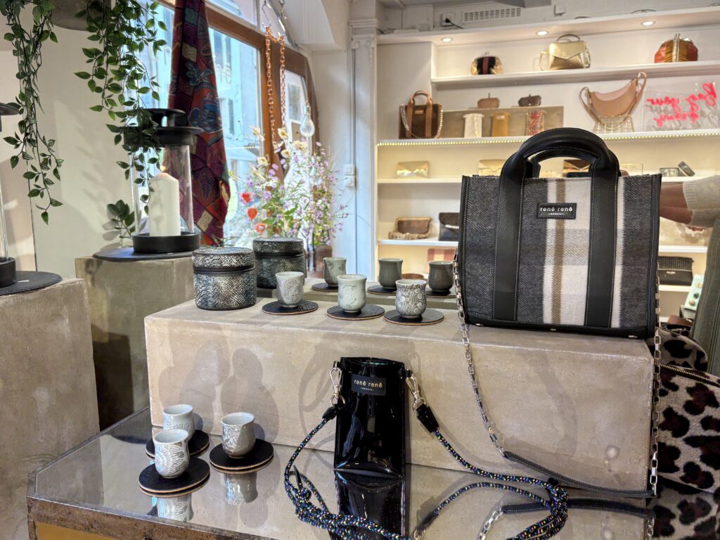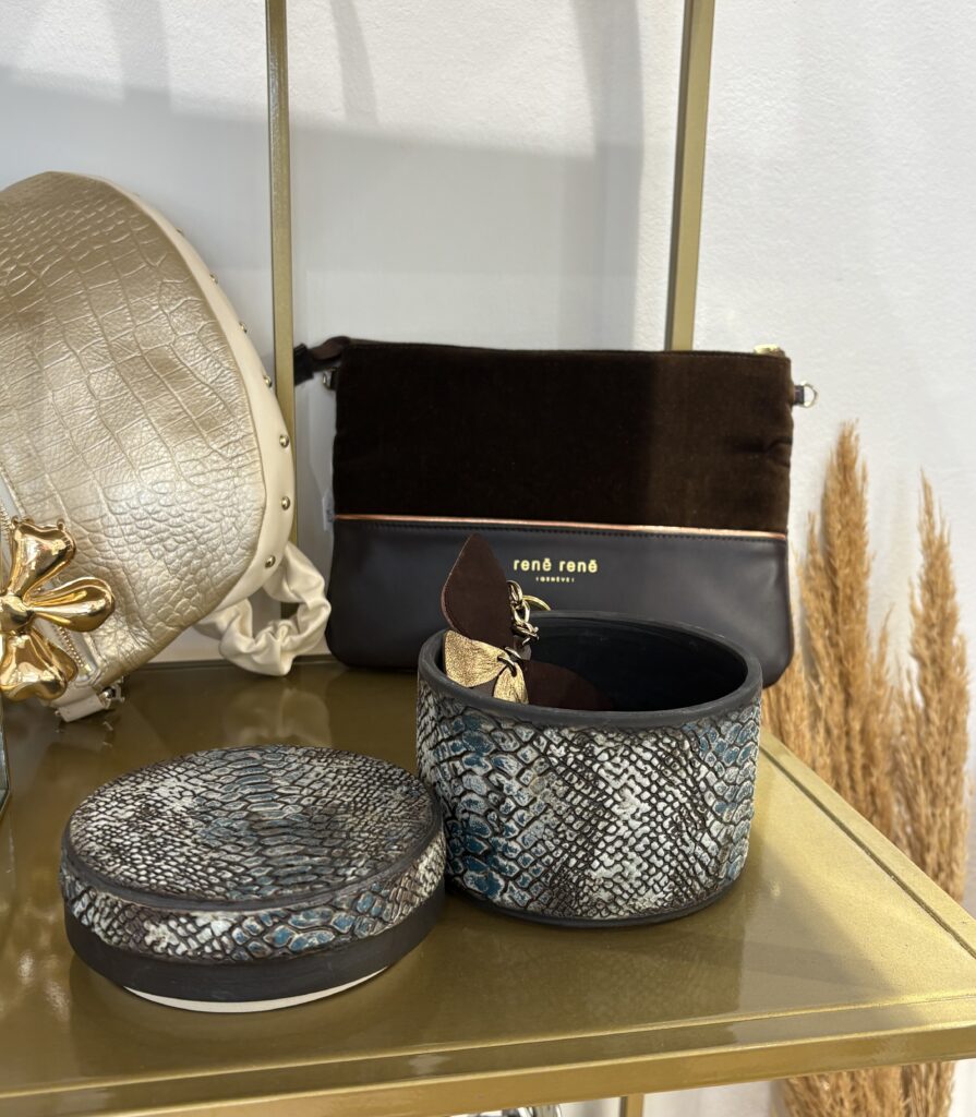 Je suis invitée par la maroquinerie genevoise René René. Je présente un travail en céramique sur les boîtes avec un décor trompe l’œil en peau de serpent et des vases tressés qui rappelle le tissus tweed. Sylvia Blondin, la créatrice de René René y présente ses beaux sacs uniques parmi plein d’autres accessoires.